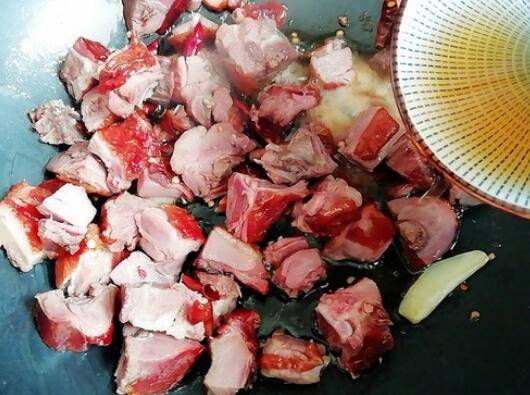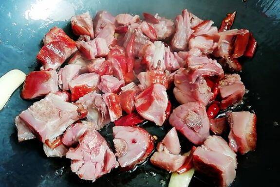 3、起油锅,放入姜片和干辣椒煸香,放入腊鸭腿炒一会。