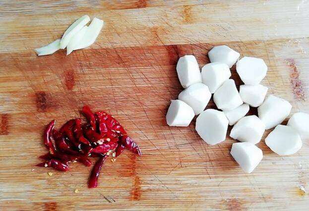 2、把姜去皮洗净切片;干辣椒浸泡一会切小段;芋头去皮洗净,对半切开。