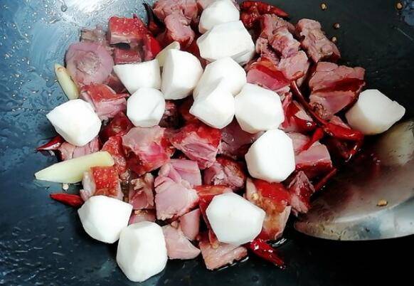 5、放入芋头翻炒一会。