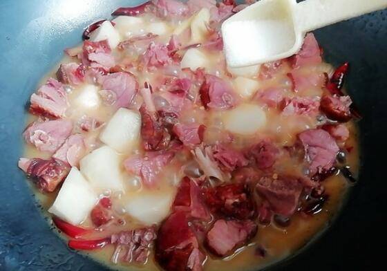 7、撒入少许盐炒匀。腊鸭腿一般都有咸,可以先尝一下味道再决定要不要加盐。