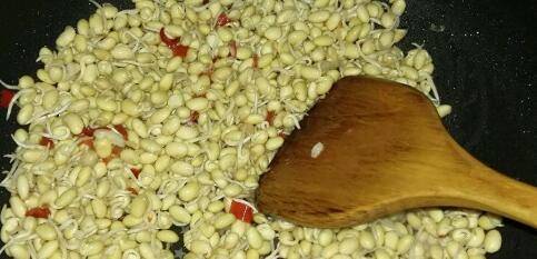 锅底爆香蒜末,放剁辣椒炒香,放黄豆芽炒出香味,放少量水炖五分钟。
