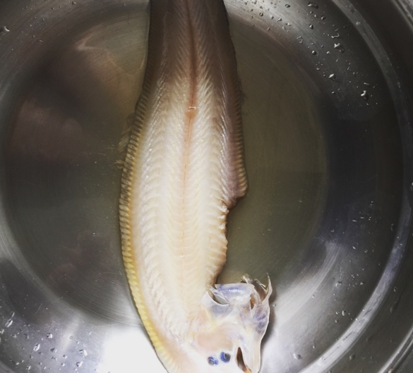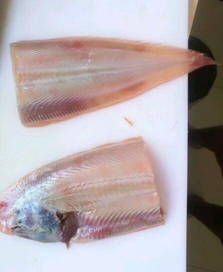 2、舌鳎鱼鱼皮撕掉,内脏清理干净,整鱼清洗干净后,把鱼对半切开。