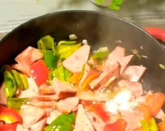 准备食材:火腿200克、青椒50克、红椒50克、葱、姜、蒜适量、料酒10克、白糖5克、盐2克、鸡精2克。