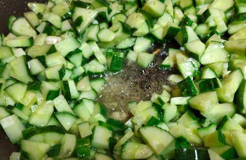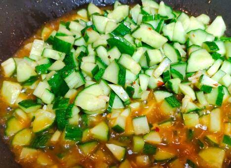 黄瓜切丁,牛肉逆着纹路切丁用玉米淀粉、生姜腌制。取小碗,放入水、豆瓣酱、生抽拌均匀备用。