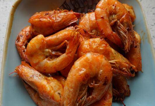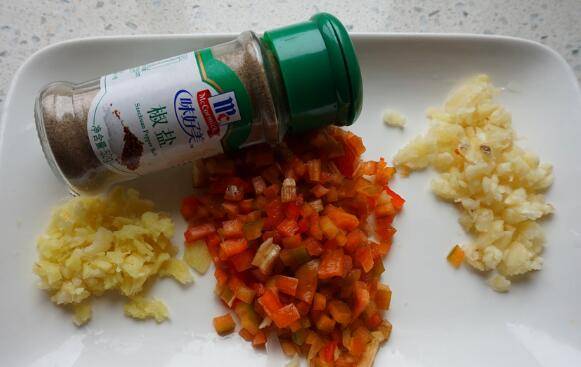 用料:大虾500克、椒盐粉1勺、红椒1个、姜末25克、蒜末25克、料酒2勺、陈醋5滴。