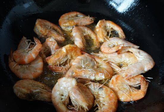 4、腌好的虾把水控干,锅里烧热多一点的油虾下锅煎炒。