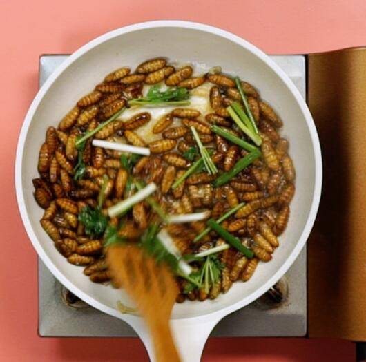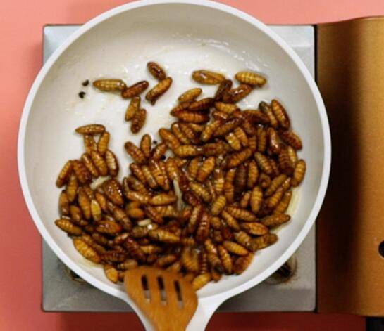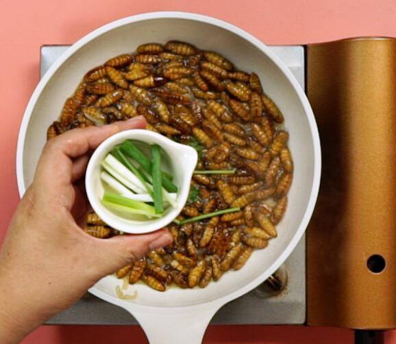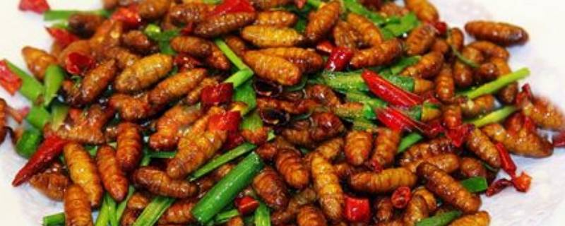 加入蚕蛹、花椒、大火煸炒3分钟。