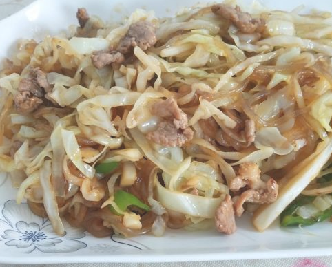 圆白菜炒倒后,再加入盐、醋、白糖、生抽、老抽和蚝油翻炒均匀,最后加入煮软的粉条翻炒均匀即可出锅装盘。