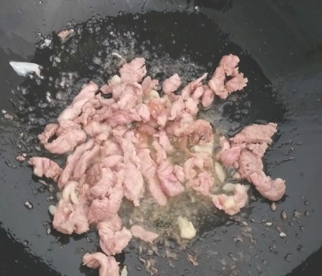 锅中倒入花生油,加入肉丝炒得肉色发白,再加入蒜末炒香。