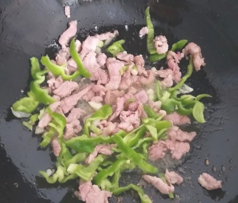 先加入青椒翻炒,再倒入圆白菜丝大火翻炒。