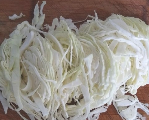 圆白菜清洗干净后,再切成细丝,青椒切成细丝。