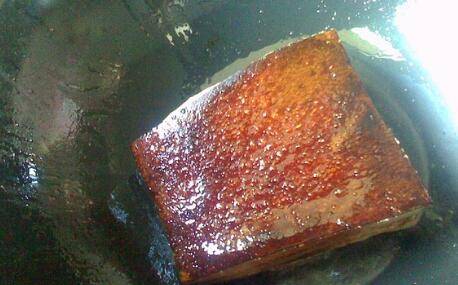 锅内放入油,油热后将肉皮的一面放入锅中,炸至肉皮变成棕红色和起了小泡,翻个面稍炸一下。
