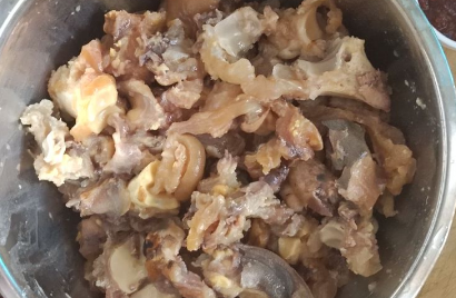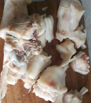 将带骨牛蹄沿关节剔开,洗清!加生姜、花椒、料酒高压锅内大火煮1个半小时。