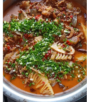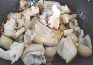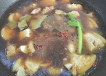 起锅放油,将大葱榨干后捞出,依次放入火锅底料、郫县豆瓣酱、泡仔姜、各种辣椒、香料、老抽、生抽、盐、冰糖,中火熬出香味后,加入牛黄喉、牛肚、笋、魔芋、翻炒入味,加开水没过菜品,快熟的时候,加牛蹄,炖煮3分钟后出锅,撒上葱花既成。