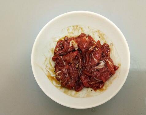 1、牛肉顶刀切片,加入1茶匙料酒,2茶匙黑胡椒酱。
