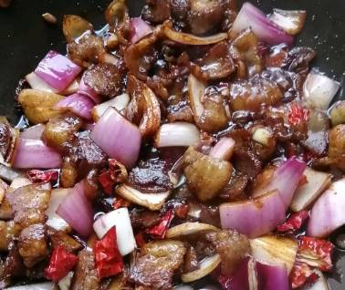 调入老抽,生抽,十三香,糖增色增香。继续炒至花肉微焦黄。