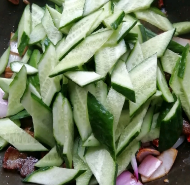黄瓜1-2根、五花肉100克、洋葱半个、大蒜1瓣、姜5片、干辣椒3-5个、油适量、生抽10ml、老抽5ml、糖1克、胡椒粉少量、味精1克。