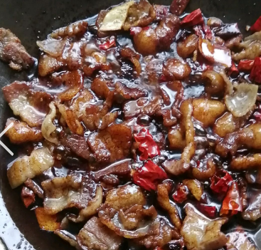 炒锅点火入油滑热,入五花肉慢火煸炒出油,入姜蒜干辣椒继续炒香。
