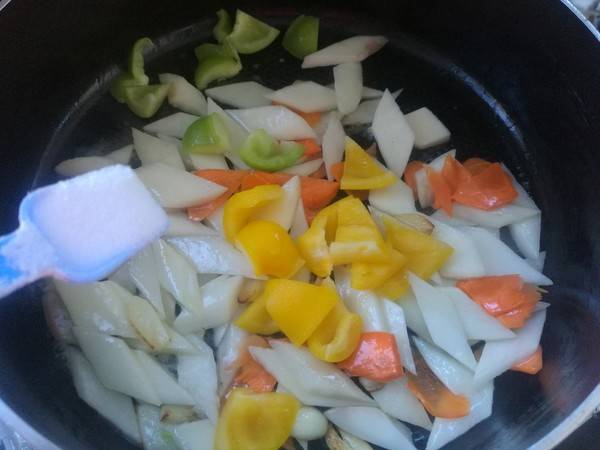 3、放入胡萝卜片、黄色甜椒块、青椒块翻炒均匀,加入适量的盐调味,炒匀即可出锅装盘。