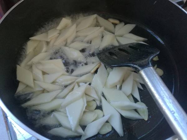 2、炒锅烧热,倒入适量的食用油,下入葱花、蒜片炒出香味,把山药片放进去,翻炒均匀。