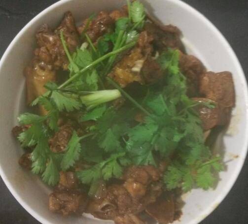 用料:鸡半只、姜一块、蒜两根、香菜少许、干辣椒一把、料酒适量、酱油适量、盐适量。