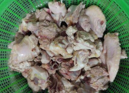 2、半边鸡用小刀去皮,割下肥油,然后切成小块。