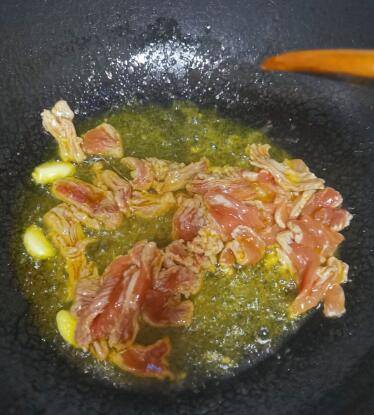 锅内下油烧热,加入蒜片翻炒,下肉,加入十三香、鸡精。