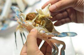 从底部三角区域下端向上掀开螃蟹壳,拆下钳子,用刀背敲碎,炒的时候入味些。