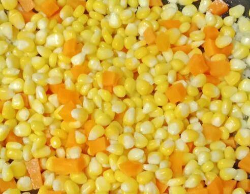 7、锅中热油,下蒜末爆香,倒入玉米粒和胡萝卜丁翻炒。
