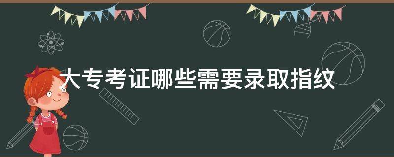 专升本、国考、教师资格证、四六级考试、计算机考试等需要录指纹。大专一般指专科。专科,大学专科的简称,是高等学历教育的基本组成部分,一般招收高中毕业生或具有同等学历者,修业年限多数为三年(非全日制大学专科学历教育的修业年限视情况而定)。专科学历主要分为全日制专科和非全日制专科两种。全日制专科通常是由普通高等学校招生全国统一考试录取,全日在校学习。非全日制专科通常为成人教育、网络教育、开放教育和高等教育自学考试等。