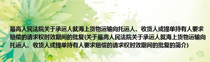 本文关于最高人民法院关于承运人就海上货物运输向托运人、收货人或提单持有人要求赔偿的请求权时效期间的批复的简介就讲解完毕,希望对大家有所帮助。