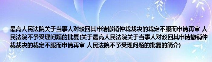 本文关于最高人民法院关于当事人对驳回其申请撤销仲裁裁决的裁定不服而申请再审,人民法院不予受理问题的批复的简介就讲解完毕,希望对大家有所帮助。