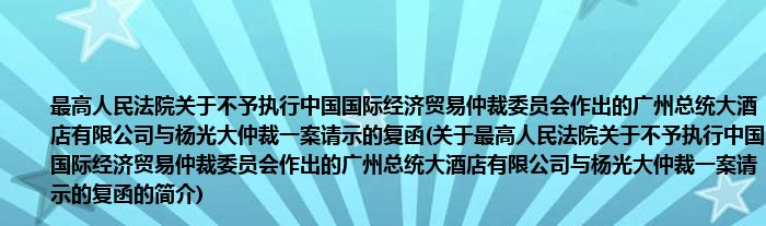 大家好,最高人民法院关于不予执行中国国际经济贸易仲裁委员会作出的广州总统大酒店有限公司与杨光大仲裁一案请示的复函,关于最高人民法院关于不予执行中国国际经济贸易仲裁委员会作出的广州总统大酒店有限公司与杨光大仲裁一案请示的复函的简介很多人还不知道,现在让我们一起来看看吧!