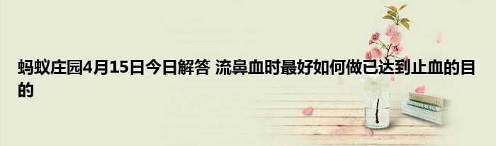欢迎大家来到这里,能进来的小伙伴都有玩蚂蚁庄园的,支付宝蚂蚁庄园每天都会在小课堂更新一道题目,答对即可领取小鸡饲料180G,4月15日蚂蚁庄园问题是:流鼻血时最好如何做已达到止血的目的?很多小伙伴都不知道流鼻血时最好如何做已达到止血的目的这个问题的答案是什么,那么小编就为大家分享下4月15日蚂蚁庄园课题问题的答案,希望对大家有所帮助!
