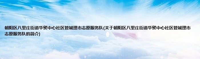 1、 朝阳区八里庄街道华贸中心社区管城理市志愿服务队是由朝阳区八里庄街道管城理市志愿服务队领导下的志愿团体。