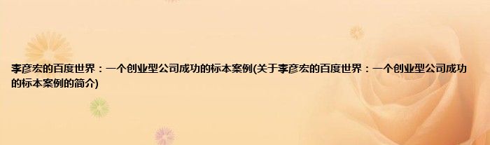 大家好,李彦宏的百度世界:一个创业型公司成功的标本案例,关于李彦宏的百度世界:一个创业型公司成功的标本案例的简介很多人还不知道,现在让我们一起来看看吧!
